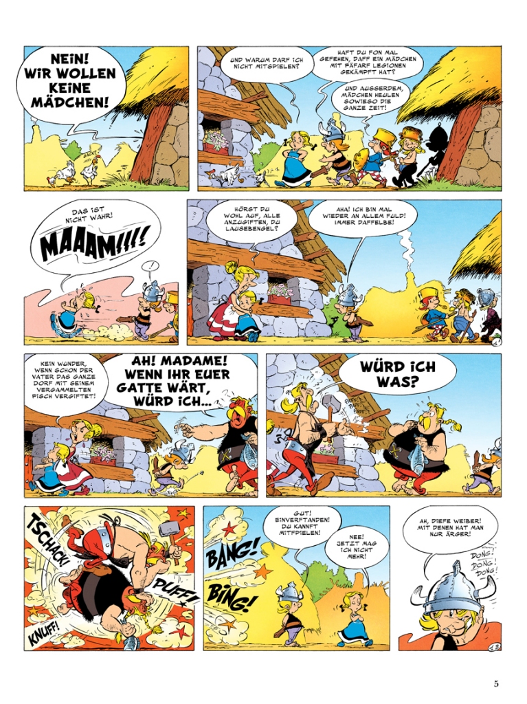 Weil Feministinnen die Welt der Gallier allmählich frauenfeindlich fanden, ließ der Autor einen weiblichen Barden aus Lutetia kommen und sorgt damit für Aufregung im Dorf. Asterix dreht fast durch, Obelix hält sich zurück. Ein ausgezeichneter Ansatz für ein vergnügliches Abenteuer.